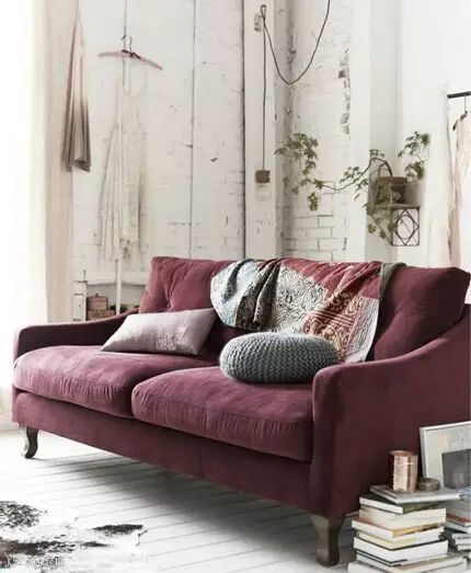 勃艮第酒红色的搭配是整个空间里的亮点。一张勃艮第酒红色的棉麻料沙发,质地柔软,再配以黑灰两色,这样的文艺范中还带点慵懒的味道。