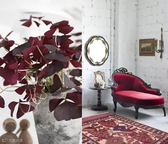勃艮第酒红又名毛茛色,它作为红色调中的一种,因与法国勃艮第所出产的勃艮第红酒颜色相似而得其名。近年来,酒红色在设计上一直备受欢迎,今年的家装设计中,这种勃艮第酒红色也不可忽视。红色的墙面地面、软装上可以采用该颜色搭配。
