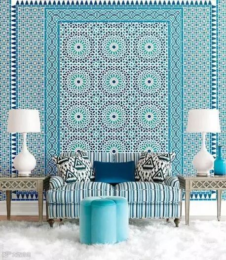 孔雀蓝是一种遥远而神秘的颜色,可以说,孔雀蓝在家居设计中是多变的,不一样的搭配会呈现不一样的风格,因为对于它的色彩定义,归纳为模糊色,不同的人对其有不同的定义。孔雀蓝色调的家居设计往往给人以神秘的力量, 一般墙面及装饰品采用孔雀蓝为多。