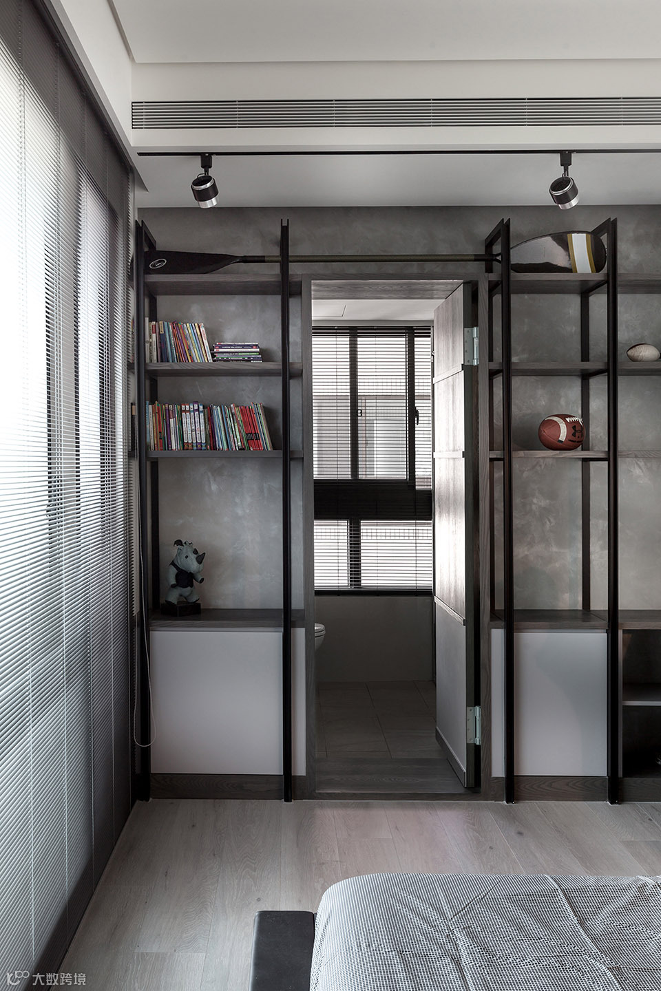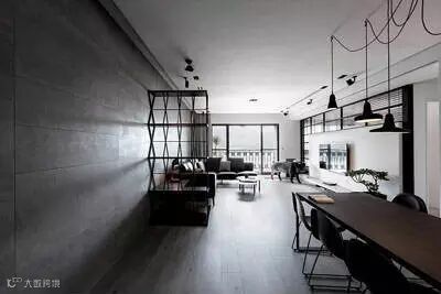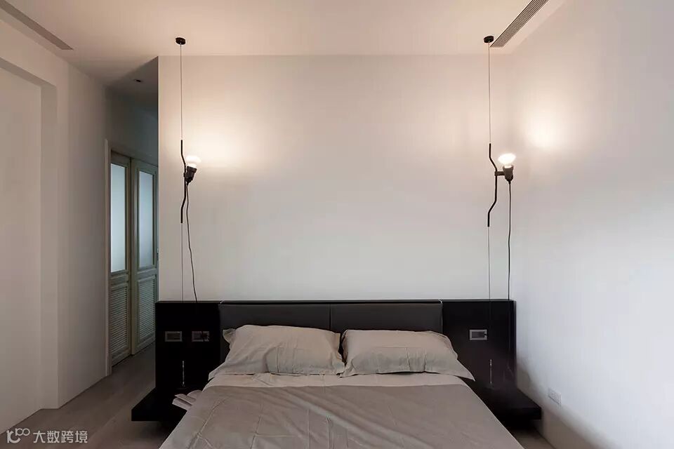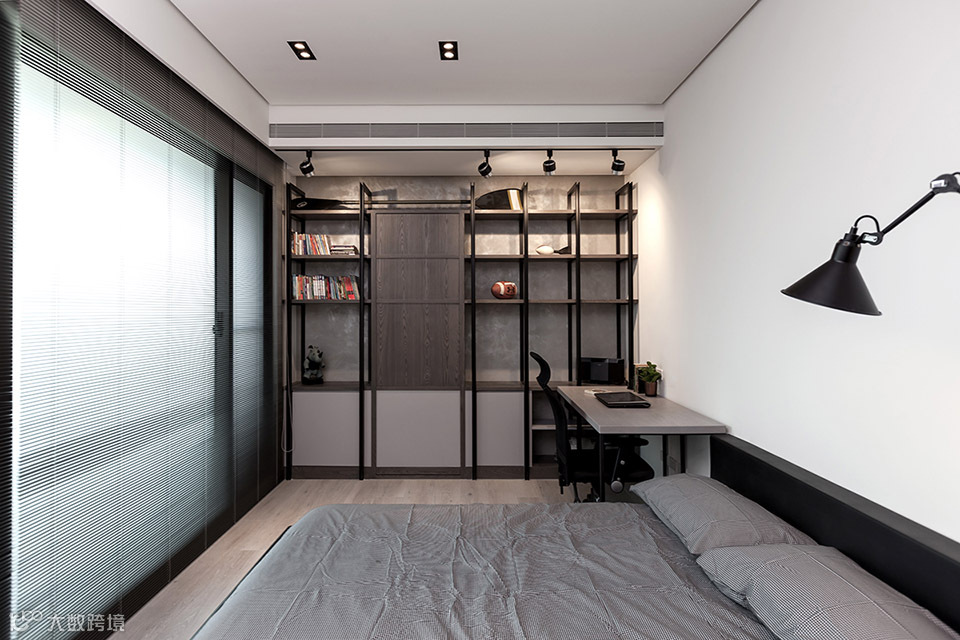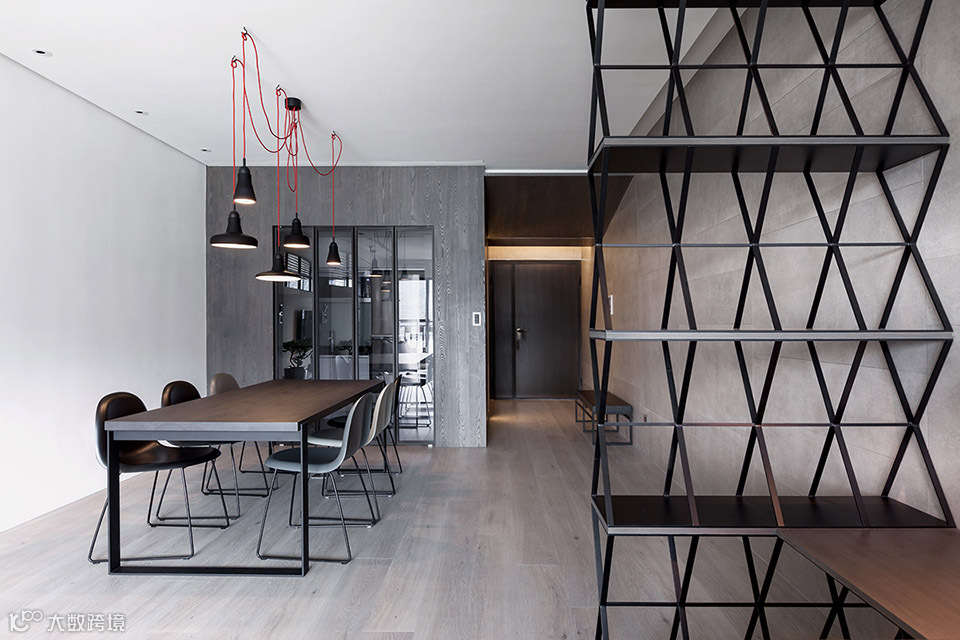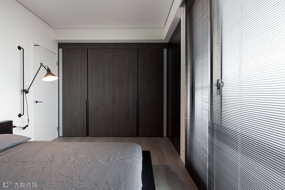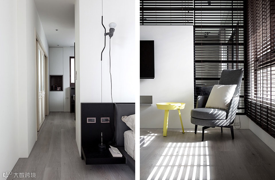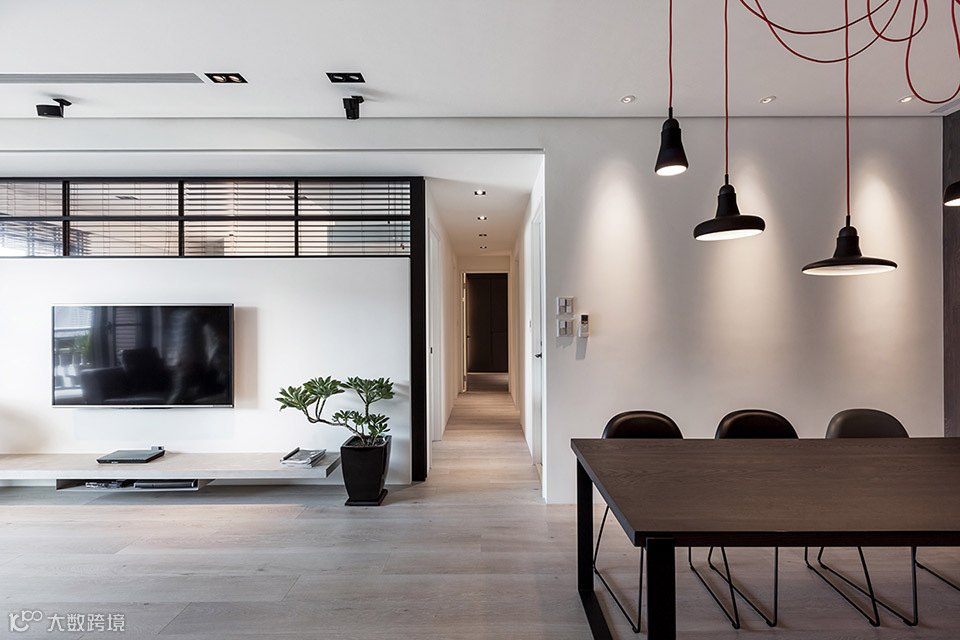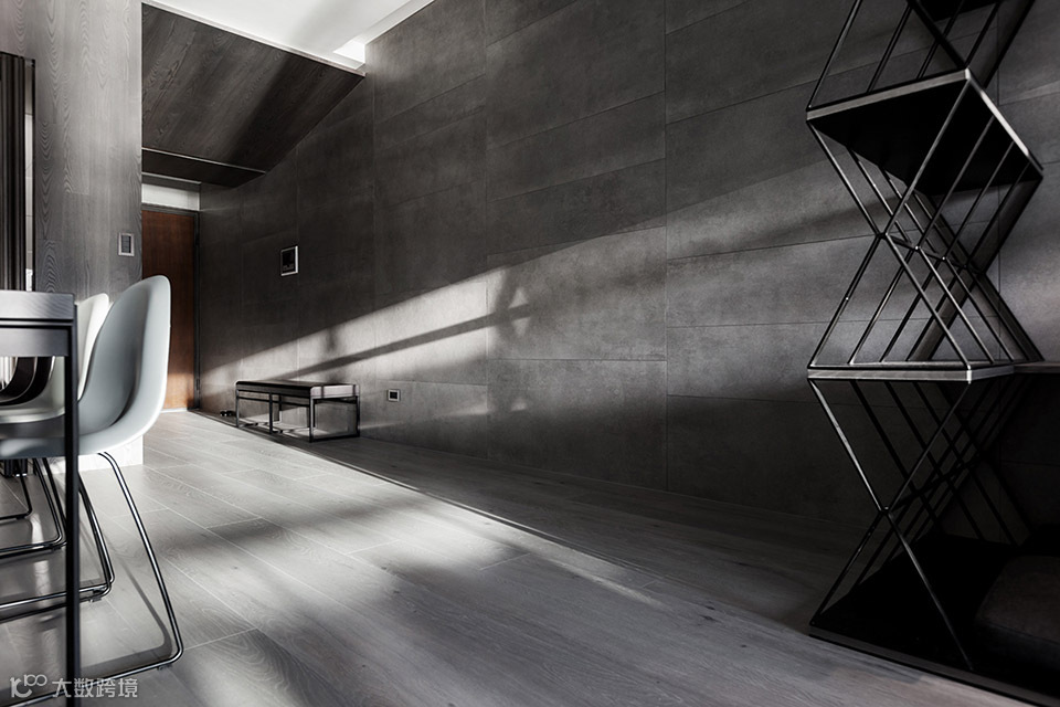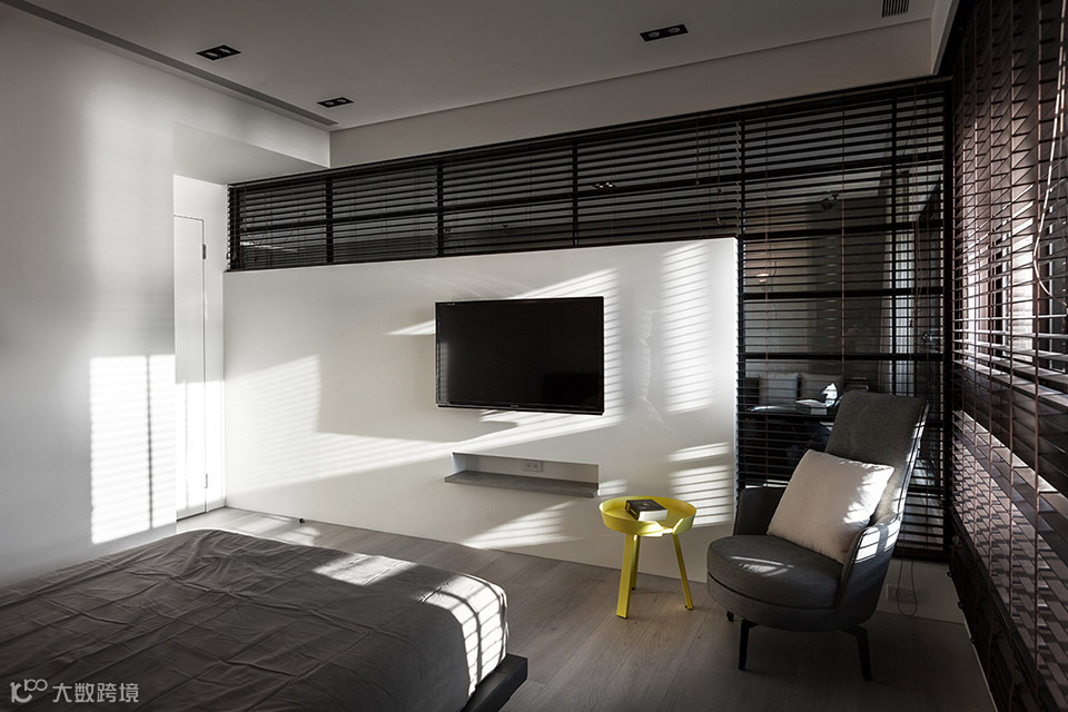 此案坐落于淡水河畔边,从客餐厅和主卧室看出去都可直接欣赏到淡水河湾的景色。为了保持空间的开阔感受,设计导向主要著重于强调空间的穿透性,突显窗外的河岸风光及採光面向的优势。所以为了让採光更大面积地纳入公共空间,我们将区分客厅与主卧室的电视牆面以穿透的L型的金属框架作为隔间,在视觉上将电视背牆与天花、牆柱托开。客厅及卧室透过了这面窗型隔间,两室在不发一语的情境下也能透过天光共享自然;或者透过开关灯及窗帘等活动来分享生活。长时间的光影变化是自然的节奏;短时间的光影变化则是人的节奏。