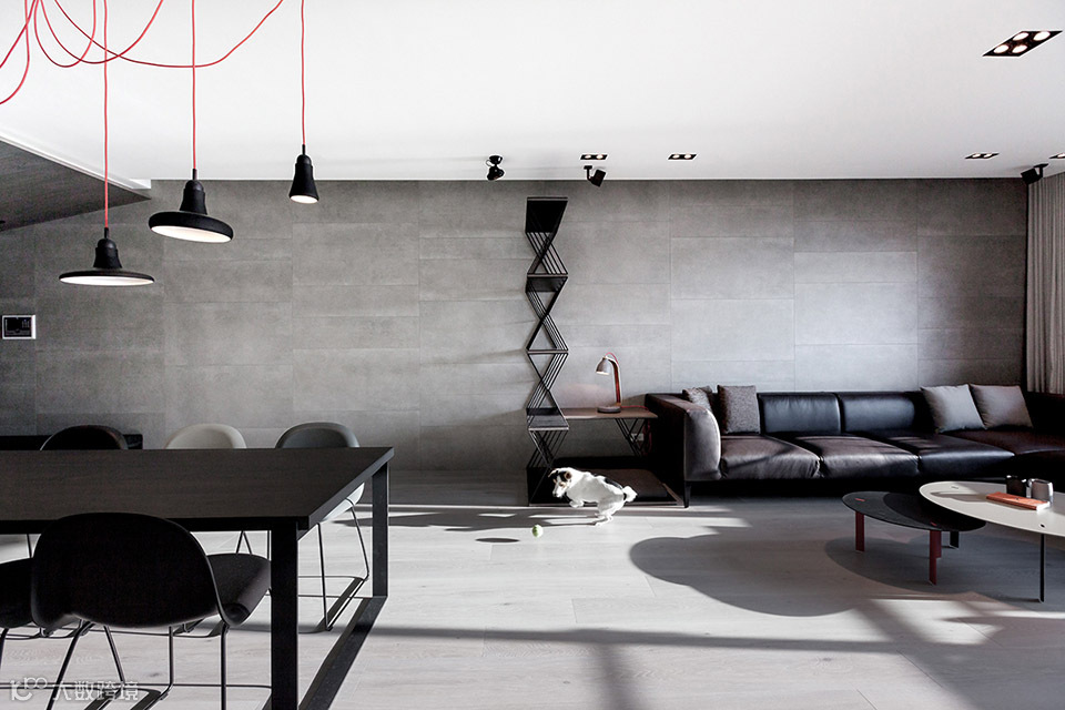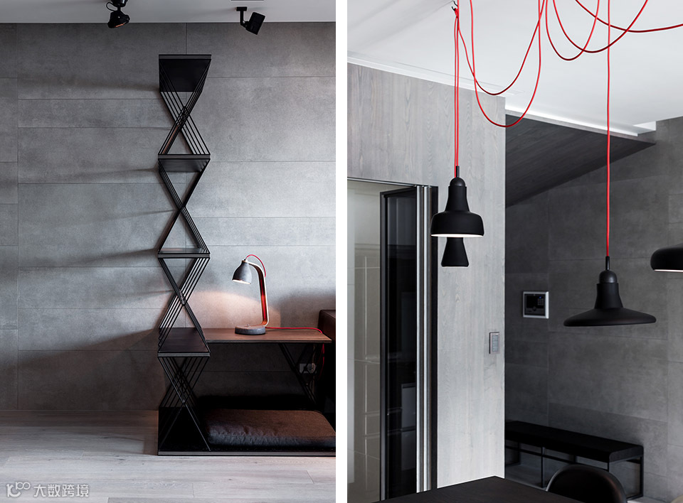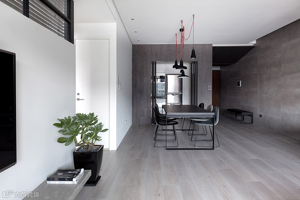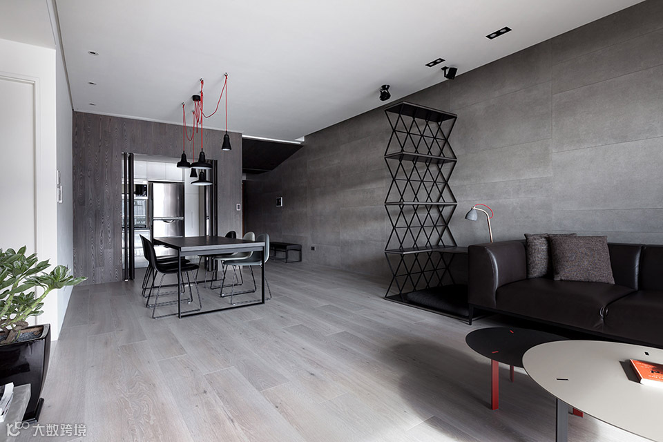 家饰软件配合空间,配色以重点局部式的橘红色为装点,整体空间以灰色为主要色调,经由材质的质感呈现变化。自入口玄关具有斜度的天花转折至客厅空间,整道立面选用大尺寸的水泥质感磁砖,以不间断的铺面方式,一气呵成贯穿至底端,利用延续性增加空间气度。