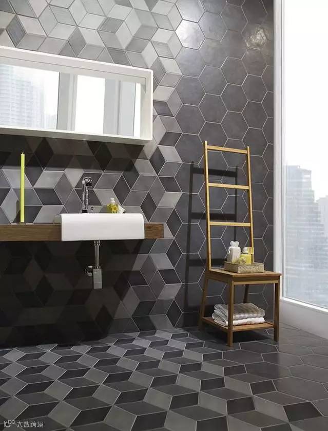 将六角形分割成 3 个菱形方块,采用深浅不一的灰阶色调,在视觉上构成立体感,相当具有摩登风范!