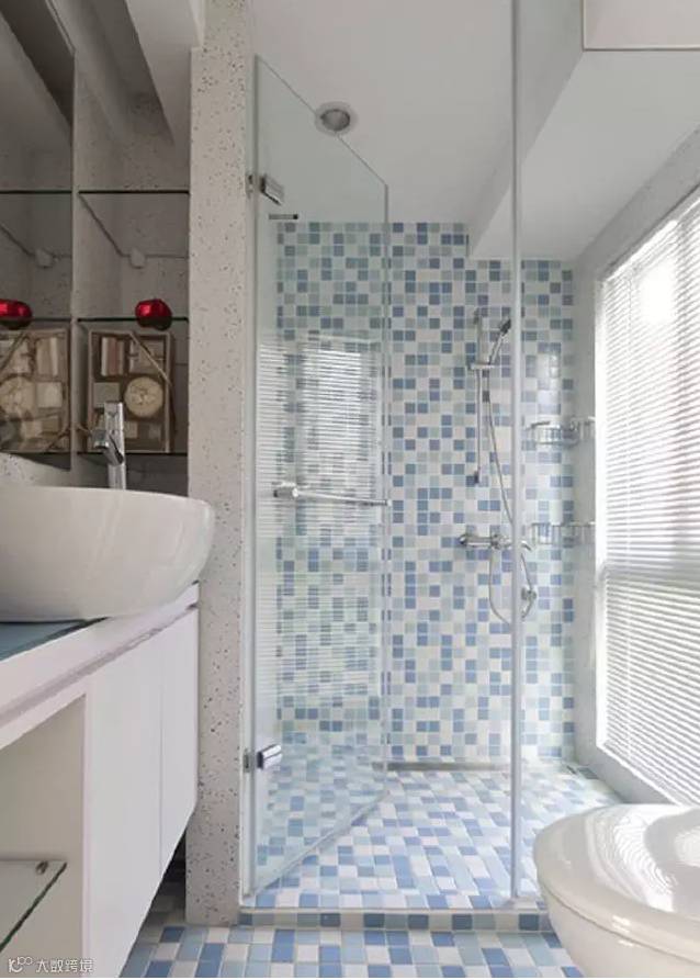 简单的小方格也是许多浴室设计爱用的磁砖表现方式,从墙壁延续至地面,将深浅不同的蓝色小方格砖错落排列,具有将空间放大的视觉效果。