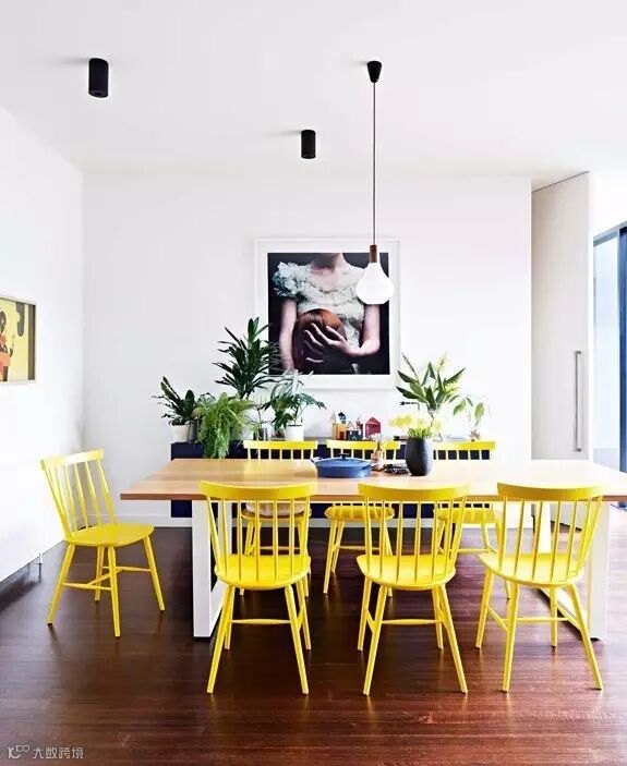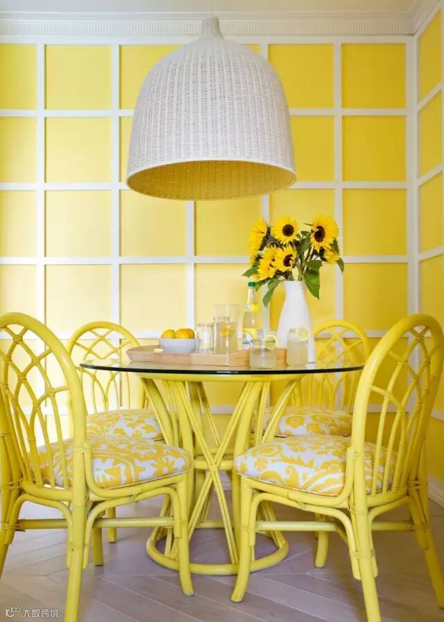 在明亮的黄色室内,墙面、椅子的颜色