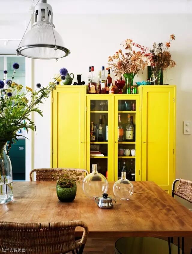 鲜艳黄色配上原木家具搭配