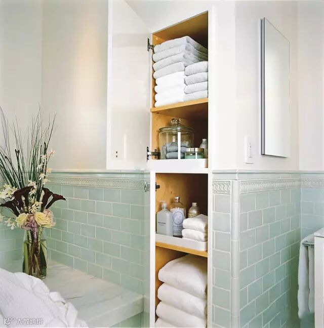 【亮点】在卫浴间的角落里设置一个内嵌式的储物空间,用隔板划分区域,两扇柜门将杂乱的空间隐藏起来。