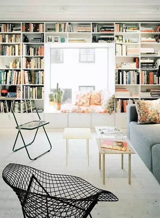 【亮点】用隔板组成一面通顶大书墙,下面的柜式收纳可隐藏起来,空出飘窗可作为舒适的阅读区。