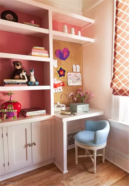 卧室的临窗角落,光线明亮很适合打造书房。利用了墙柜的设计,节省了空间,又觉趣味无穷。嫩蓝色座椅和粉色墙壁很适合粉嫩嫩的可爱公主。