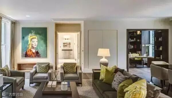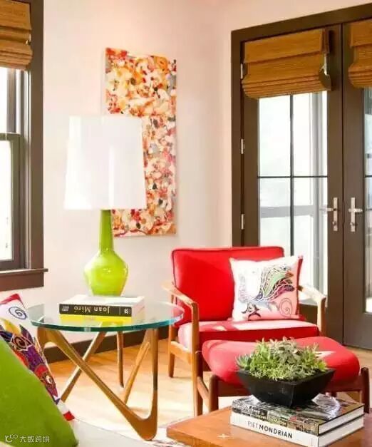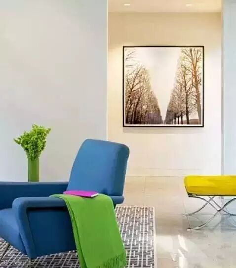 如下图:这是一个色彩淡雅的现代风格的房间。浅色的墙面和窗帘,搭配深褐色沙发+茶几,米色单椅。直线条的家具,干净利落没有复杂的装饰。抱枕用到几何图案和不规则的抽象图案,符合需要的现代感觉,不显得沉闷。墙面上一幅色彩明亮且饱和度较高的油画,使空间明亮有趣。在沙发抱枕上,我们可以找到这幅画里面所用到的一些黄绿色。这种从装饰品中去获取颜色来做搭配的方法可以帮助我们在色彩搭配时避免盲目,无头绪的去选择颜色。最后,全部的东西都被一块温暖自然的地毯托起。