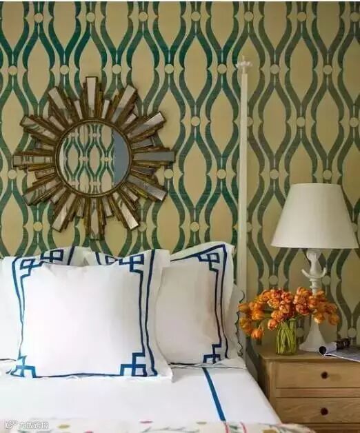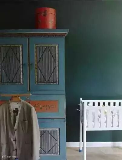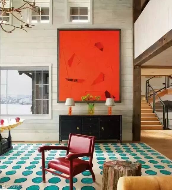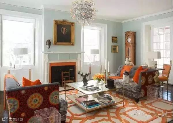 如下图:客厅墙面用了干净明快的水蓝色,再加入饱和度较高的橘色增添空间的活跃感。最明显的是地毯,大比例的橘色几何图案。灰色的沙发靠背前放了橘色抱枕+毛毯,茶几上的鲜花,壁炉上的橘色,金色画框,橘色点缀的吊灯,木色的座钟以及橙色的单椅,这些暖色与墙面都是补色对比。