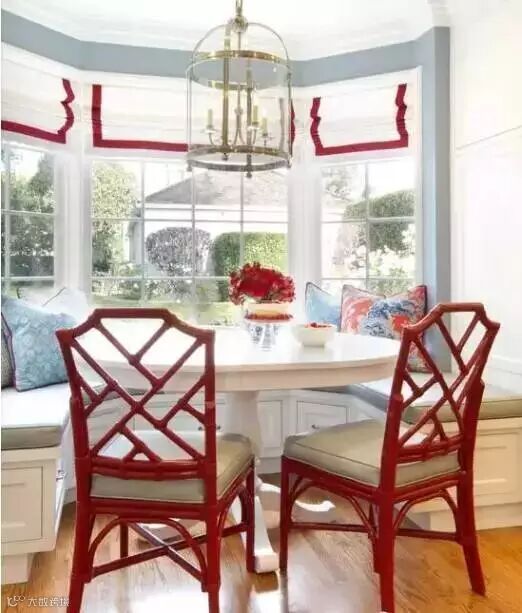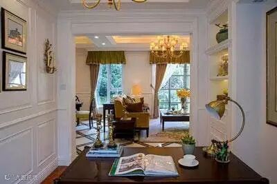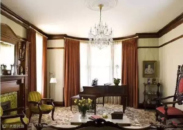 如下图:褐色与米色首先为整个房间打底,浅色底带花纹的地毯带有一些冷暖对比,装饰性强。然后,几种突出的暖色(金色罗马杆搭配橘色窗帘,黄色扶手椅,红色的高背椅)强调了温暖的氛围。茶几上的鲜花+钢琴上的蝴蝶兰为房间增加春天气息。水晶吊灯,壁炉上的镜子,白色灯罩来让房间呼吸一下。