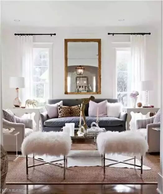 如下图:温馨柔和,采光极佳的客厅。视觉中心深色布艺沙发,具有良好的舒适性,搭配三款面料截然不同的抱枕。家具对称摆放,使空间显得井然有序。地毯,豹纹抱枕,原木镜框完成了从地面到墙面的色彩过渡。