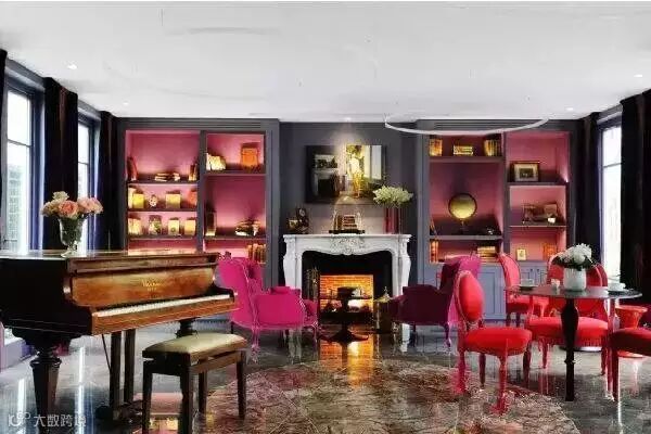 如下图:深灰色陈列柜结合粉红色配上灯光,打破常规的设计。暗色系地面出现大理石(热带雨林)拼铺,取代了地毯。家具上用了传统的款式现代的颜色,法式扶手椅用了艳丽的玫红大红色面料,华丽而不失典雅。