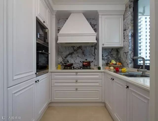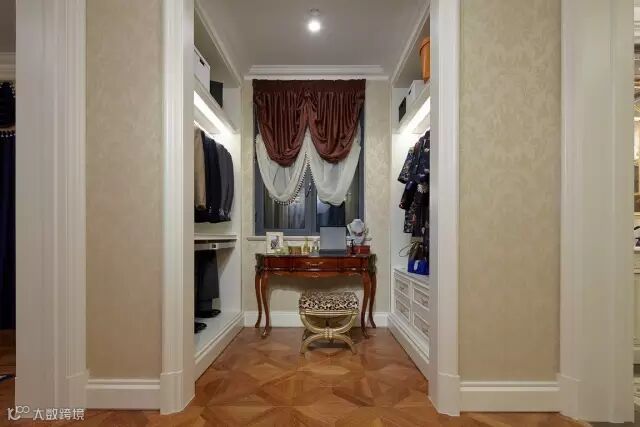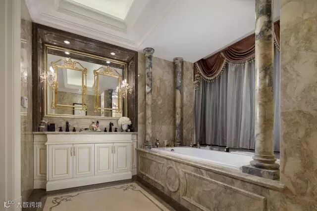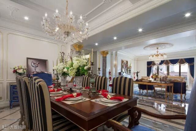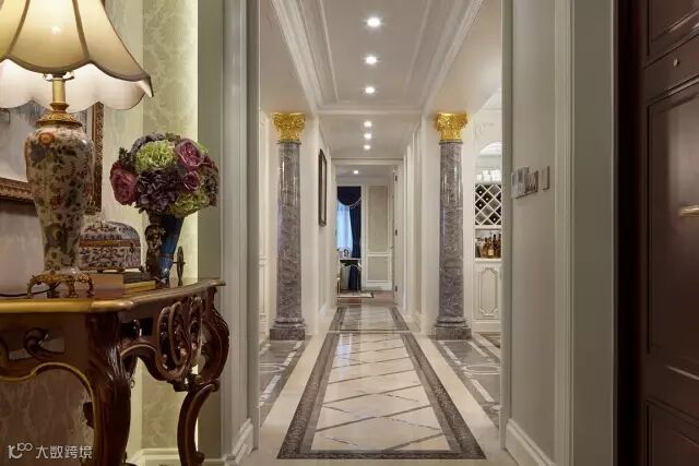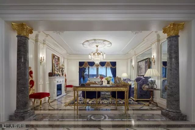 在对原有房型进行改造后,室内遵循古典主义结构学,采用和谐的对称布局和严谨的古典柱式构图,将大平层住宅的尊贵、大气、典雅表现得一览无余。走廊两侧是相对的开放式客厅与餐厅,高耸的大理石科林斯柱将高贵恢弘的气势注入空间,精美的描金卷涡花叶纹柱头,宛如艺术品般散发沉静高贵的气质。