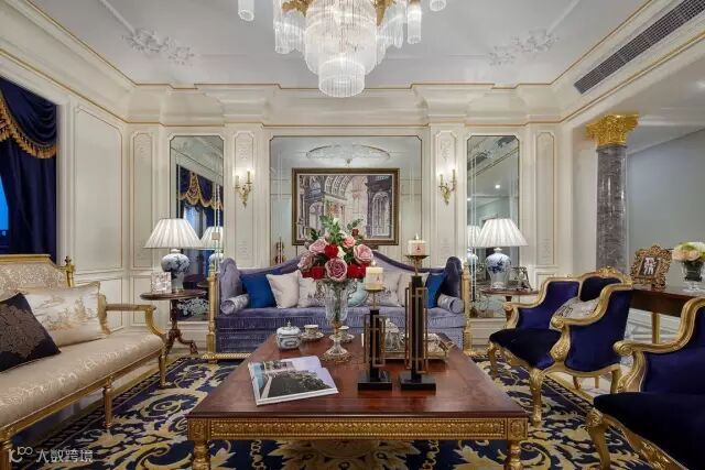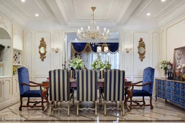 设计师仿佛化身为这段交响乐中唯一的指挥家,指尖的起伏中,皇家蓝在不同的空间中与其他色彩碰撞对话,玫瑰粉晶、静谧蓝、紫罗兰、金棕、橄榄绿……色彩之间的浓淡有致交织出优雅醇熟的感性乐章,尽显路易十五时期法式贵族生活的舒适安逸及优雅格调,恰与《洛可可主题变奏曲》中最高潮的华彩篇章相呼应。
