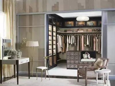除储物柜以外,步入式衣帽间一般还会有梳妆台、更衣镜、取物梯子、烫衣板、衣被架、坐凳等设施。所以步入式衣帽间,一般至少需要4-5平方米以上,在这个独立的空间外,还要有一个可以推拉的门,一个私密的封闭空间就有了。