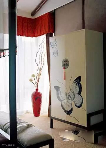 中式空间有时候难免稳重有余而轻松不足。光线的摄入量可以在一定程度上缓解空间的压迫感,较为宽阔的采光设置将大量自然光引入室内,可适当减轻中式元素本身带有的年龄感。颜色:如木色与红白黑的组合,或在空间里加入描摹工笔画的手绘家具,例如画着水墨蝴蝶的衣柜;而材质:如传统木质与其他现代材质的新搭配,不仅可以使得空间充满东方韵味,也散发着较为年轻、时髦的气息。