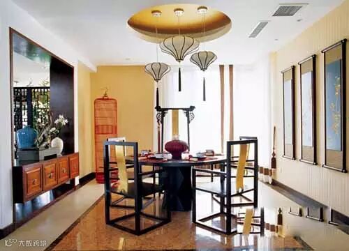圆形的吊顶,回字形的拼砖地面,这种天圆地方的室内设计自然是受到了中国风水学说的影响,运用在中式的待客餐厅里也十分得体。过于局促的空间设置会加大中式空间的年龄感,而敲掉一部分空间与空间之间的连接墙,设置为一个半开放的过渡空间,则可以缓冲空间给人的挤压感,同时,也更符合年轻人的空间使用习惯。在搭配方面,经过改良后的中式装饰物和家具自然是年轻使用者的首选。