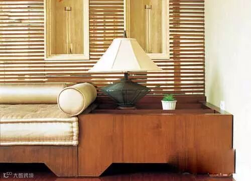 为避免中式的古板,现代居室设计更注意将传统的形式与现代的材料和使用方法融入到家具与装饰之中。这张床榻与边几经过一体设计,简约的外形保留了中式家具的特色又舒适宜人。栅栏式的木条隔断除了将两个空间分开,也形成一种半通透的神秘感,隔断上的壁龛里,摆放一枝一叶让这个角落分外的静谧。