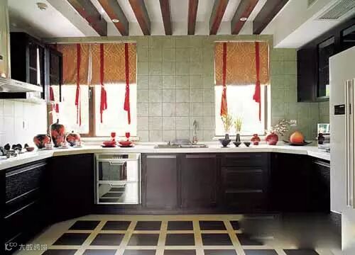 厨房是最不容易体现中式空间的地方了,现代化的厨房设备与烹饪用具都是必备的,这些都会让人觉得冰冷。所以厨房的吊顶可以利用木质横梁来代替,给人温暖感的同时,恰到好处地与井字格的地砖相呼应。另外,摩登的格子设置其实也能加强中式空间的时髦感,让那些过于厚重的气场变得更轻松、活泼。