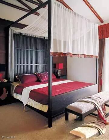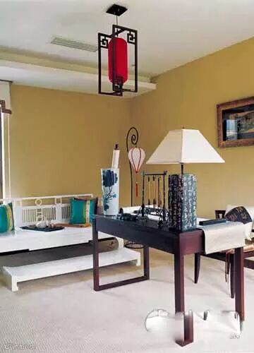 卧室一定要注意拿捏中式装饰的尺寸,前期装修时选择大面积的留白,可以冲淡后期中式家具的沉闷。一些很少用于传统中式的材质(如丝绒)和方式(如几何状排列),都可以大胆尝试,年轻人的卧房同时可兼顾很多用途,所以留出适当的发挥余地,可增添视听、娱乐设备等。