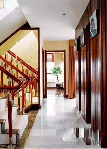 回廊是一个容易被忽视的场所,它是连接几个空间的桥梁,中式的回廊常采用雕花门和屏风作为房间之间的隔断,但是如果回廊太长,就会让空间显得逼仄。可以考虑利用分段式的墙体来代替门与屏风,再在墙面挂贴木饰板条,以便与整体环境相和谐。与走廊相连的楼梯结合木质与不锈钢两种材料设计成竹节的感觉,形式感呼应了隔断墙贴面的竖条样式。