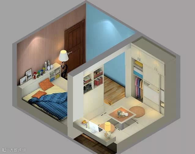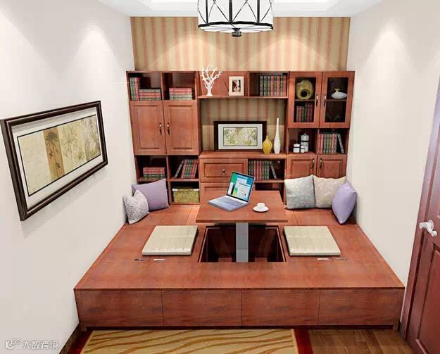 设计师支招:整个空间以榻榻米为主,用书柜和电视柜结合来区分独立的休息区和办公休闲区。整个空间可以满足休息、休闲、办公,还有强大的储物功能。