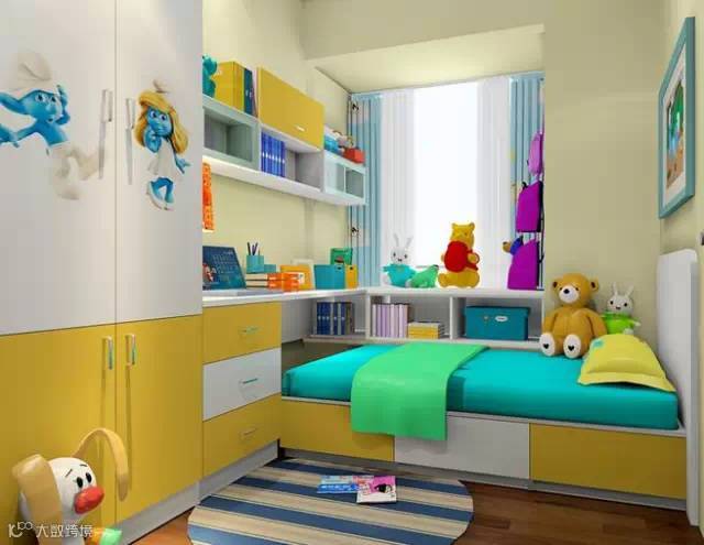 设计师支招:将书桌和飘窗结合起来,释放了空间供孩子玩耍。抽屉收纳床大大提升收纳性,便于收纳玩具杂物。