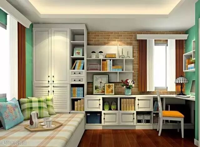设计师支招:从提升空间利用率来说,通常可以在房间的转角位置打造工作区。在书桌的选择上,可以选用带有抽屉和搁架形式的,增加储物性。