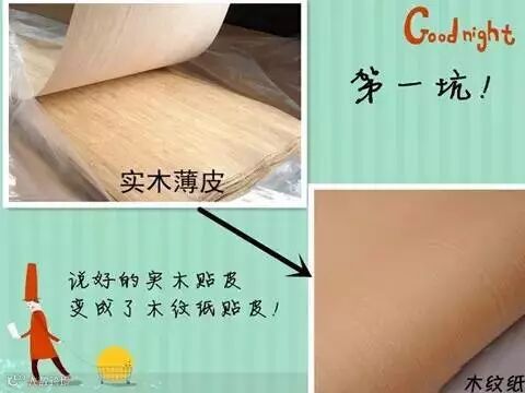 一些商家会将表面贴纸皮木门说成是贴木皮木门,木纹纸表面的纹理和真实的木纹纹理非常相似,一般的消费者不仔细辨别根本看不出来。但是,两者的价格相差很大,同样面积的木纹纸要比木皮便宜三四百元,如果“不幸”被消费者认出,商家会用“这是科技纸”来狡辩。