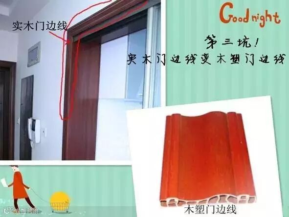 在选择木门的时候,我们往往将注意力过多地集中在门扇上,而忽略了门套和门边线。一些奸商会将门套和门扇使用不一样的材质,正规做法是门套用木料制成框架后,刨平、刨直,然后装配成型安装在墙体上,再覆盖基层板和饰面板。但目前市场上,一些劣质门套并不做基层处理,就直接在表面上贴一层很薄的饰面板,板材和墙体很难完全粘合。