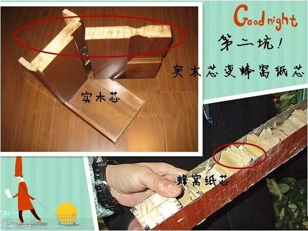 常见的伎俩是,导购在给我们展示时,总是拿实木芯的横截面样品做介绍,结果卖的却是蜂窝纸当填充物的木门,因为消费者买门时不可能劈开门去看里面的材质。
