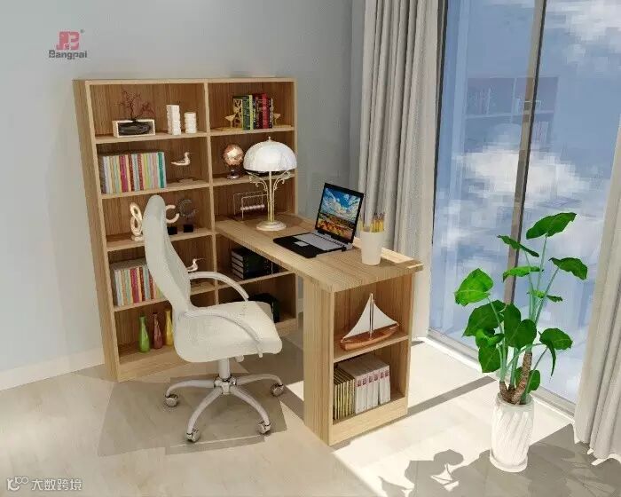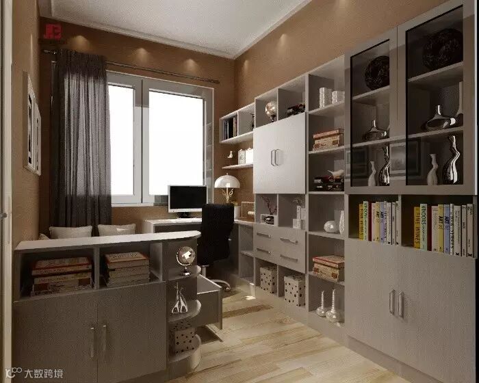 书房是体现主人文化品位的地方。但是对于一些小户型空间不足的业主来说,打造书房不是一件容易的事。但是,书房也有造型和节省空间兼顾的一箭双雕之法。在书房用木板装饰的同时依势打出一个书桌,墙面装饰与书桌连成一体,在美化设计的基础上,也在小户型装修上更加节省了空间。