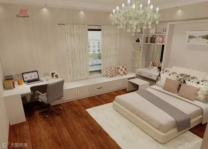 由于转角处有窗户,所以不能用衣柜封起来,既要保证采光还要保证空间利用的最大化,巧妙地造了一个梳妆台,梳妆台临窗而建,在光线充足的环境描眉打扮,除了美观之外也具有很强的实用性。也可以顺势设计书桌。