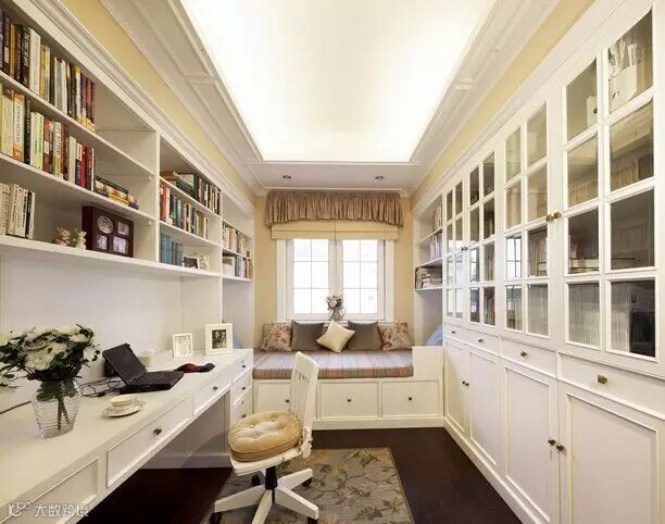 书房照明应以明亮、柔和为原则,选用白炽灯泡的台灯较为合适。写字台的台灯应适应工作性质和学习需要,宜选用带反射罩、下部开口的直射台灯,也就是工作台灯或书写台灯,台灯的光源常用白炽灯、荧光灯。书橱内可装设一盏小射灯,这种照明不但可帮助辨别书名,还可以保持温度,防止书籍潮湿腐烂。