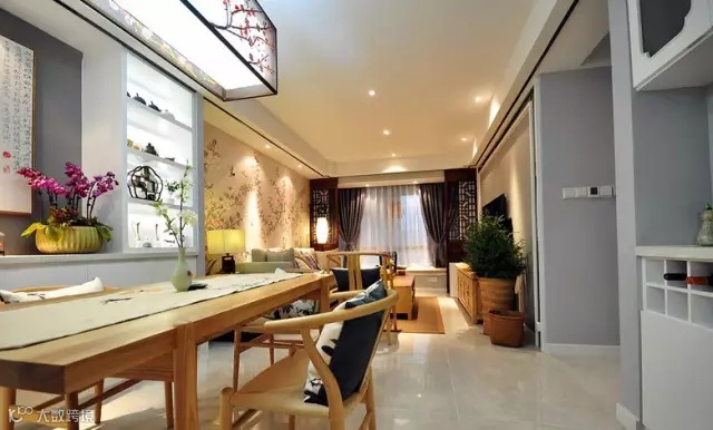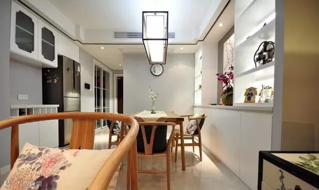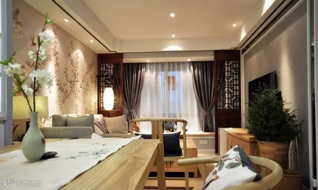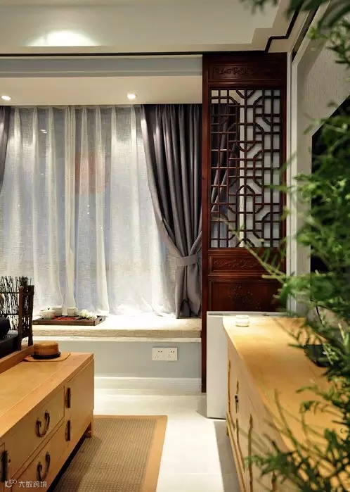 ▲ 飘窗两侧做成中式窗棂式隔断,古色古香,一方面是进门直对窗户的风水问题,另一方面就是为了对称设计