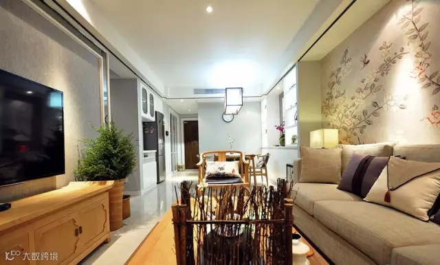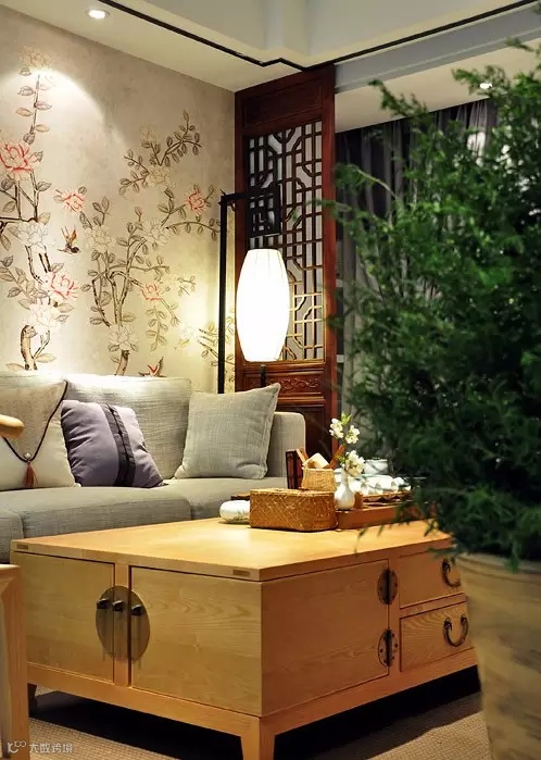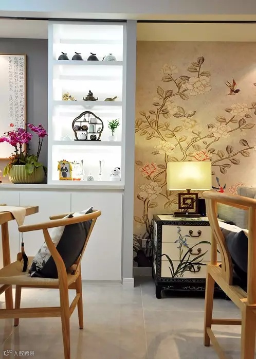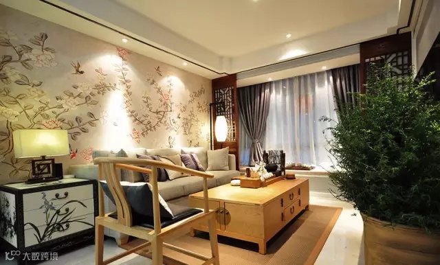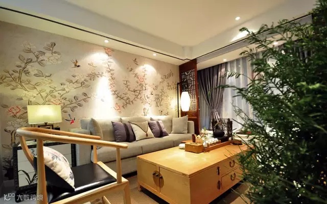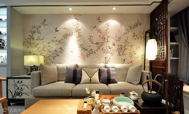▲ 沙发背景墙由一整幅花鸟画墙布铺贴