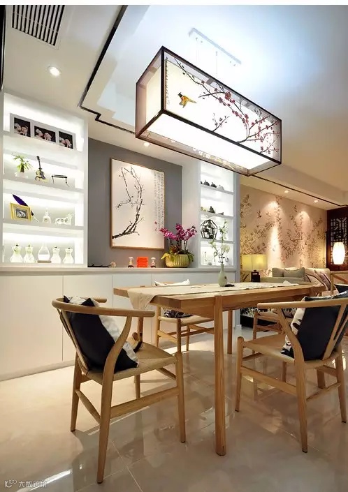 ▲ 吊灯和餐边柜装饰画上的两枝梅花竞相开放