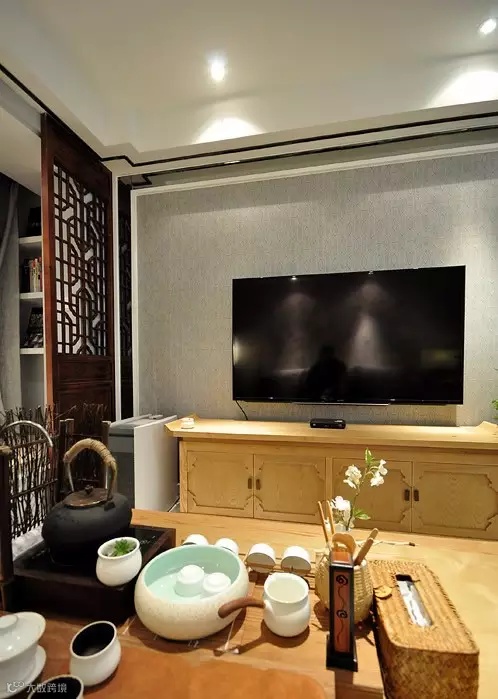 ▲ 电视墙有质感的壁纸铺贴,四周用不锈钢做边框,现代和传统的碰撞,电视柜是定制的中式案几