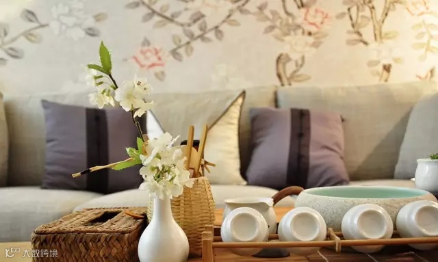 ▲ 茶具、藤编纸巾盒,白瓷花瓶,营造一点禅意