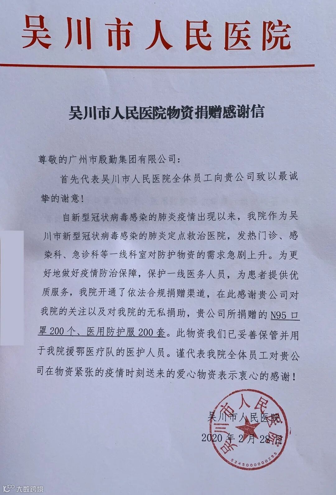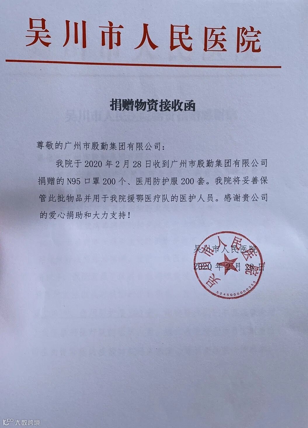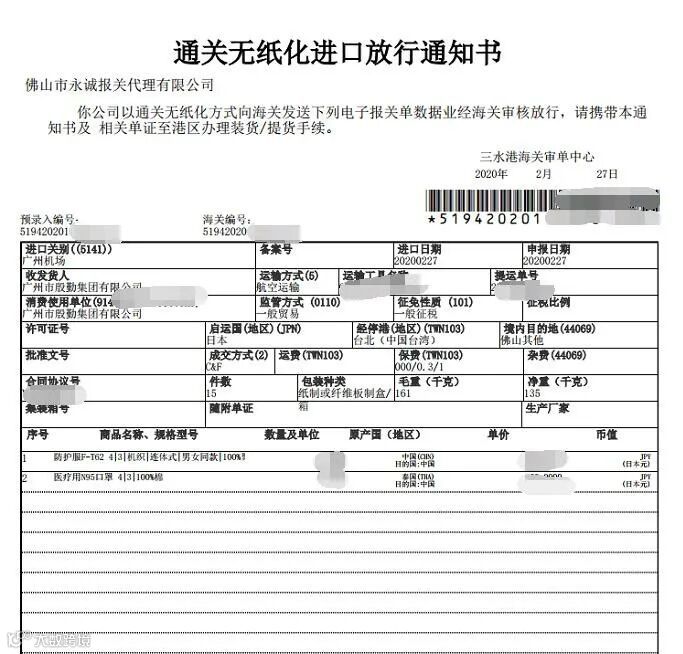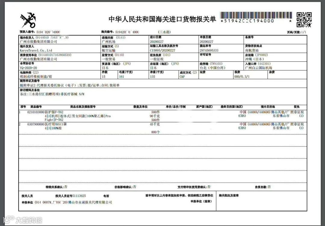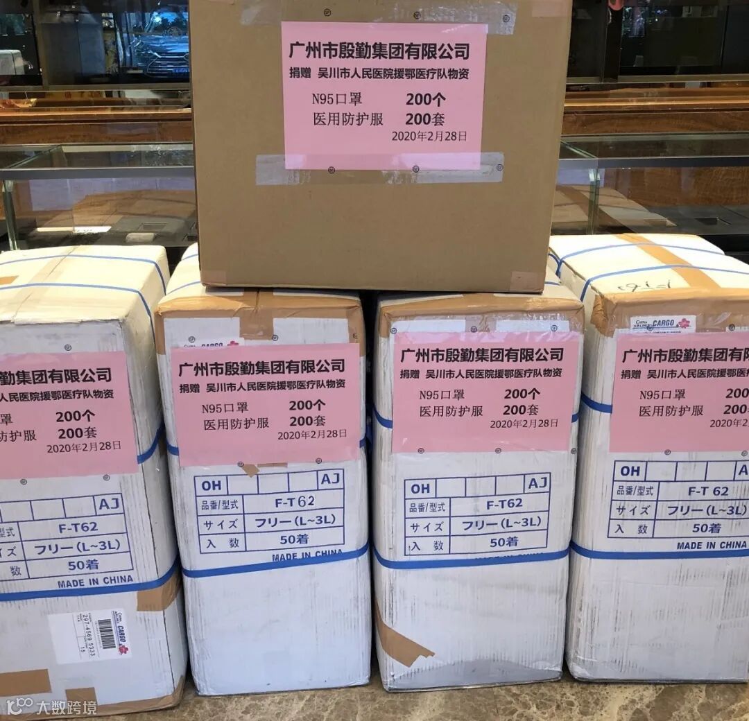 同心同德,爱心接力,殷勤集团新一批捐赠防疫物资2月26日在日本冲绳机场启运;27日进口通关;28日则火速送到了吴川新一批驰援湖北医护人员手中。
