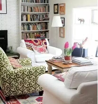 ▼两张白色沙发,搭配一张有图案有颜色的单人沙发,一下子有了视觉重心。