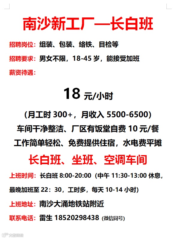 明天面试丨南沙新工厂—长白班丨男女不限丨工作轻松、免费住宿 | 工时高、坐班