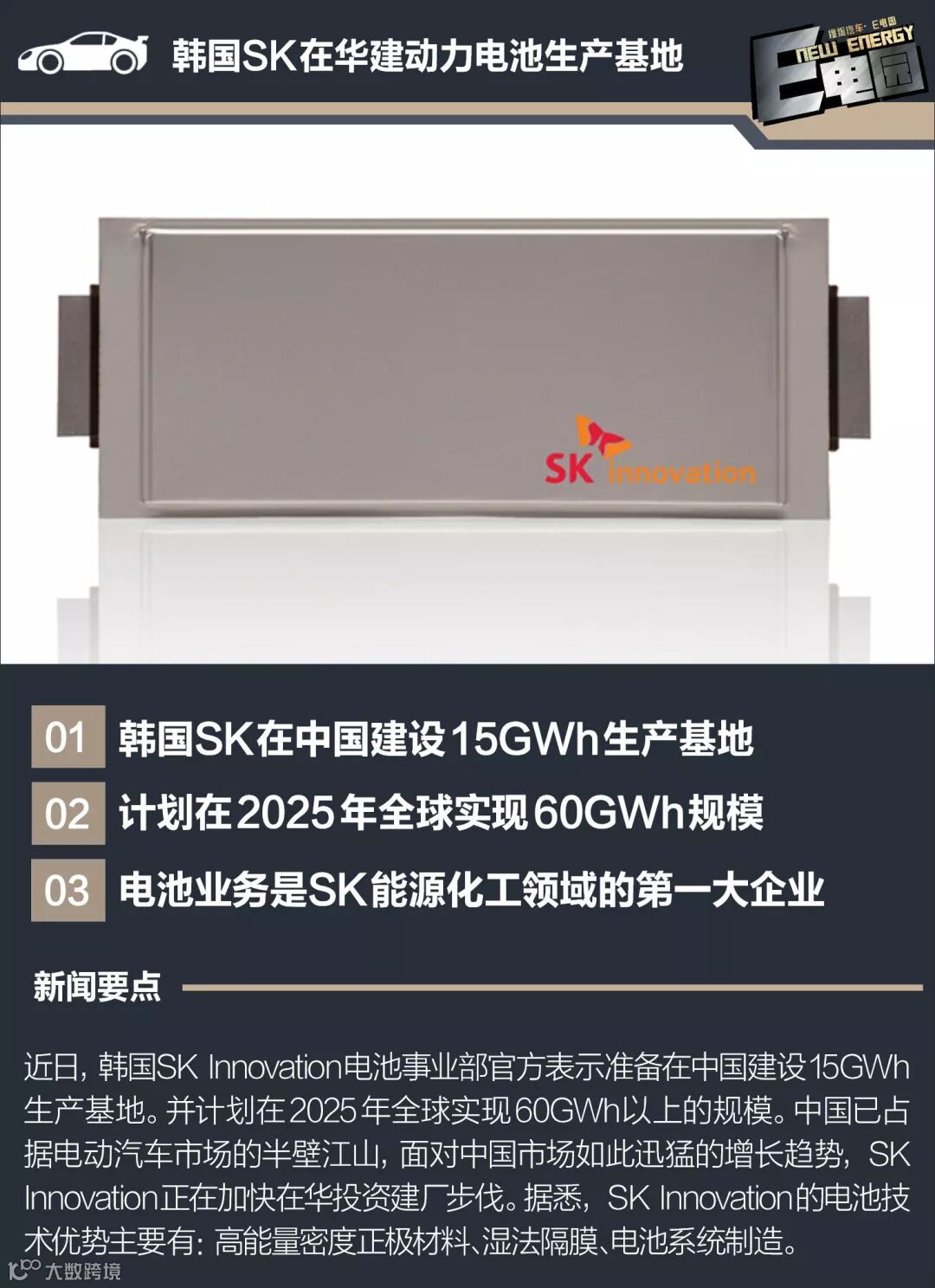E点评:为了满足消费者的需求与使用的便利性,与中国新能源行业协同发展,而与中国政府和大多数OEM都要求不断提高电动汽车的行驶距离、充电速度,SK Innovation的电池技术优势主要有:高能量密度正极材料、湿法隔膜、电池系统制造,并计划在2025年全球实现60GWh以上的规模, 面对中国市场如此迅猛的增长趋势, 中国已占据电动汽车市场的半壁江山,隔膜是保证电池性能与安全性的关键材料。