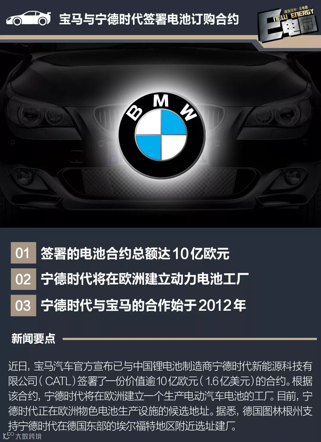 E点评:宁德时代与宝马的合作始于2012年,华晨宝马首款电动车之诺1E的动力电池系统由宁德时代和宝马共同开发,由宁德时代制造。通过这次合作,宁德时代获得了宝马的认可,成为宝马集团在中国唯一一家电池供应商,也由此成为国内首家成功进入国际车企供应商体系的动力电池企业。这并不是宁德时代公司在欧洲或德国获得的第一个电池大客户。五月份,德国汽车巨头戴穆勒公司负责采购的一名高管证实,中国宁德时代公司已经正式成为戴穆勒公司的锂电池供应商。