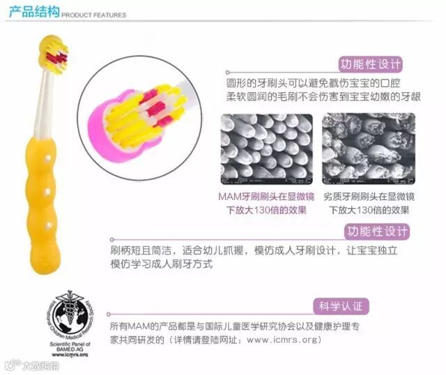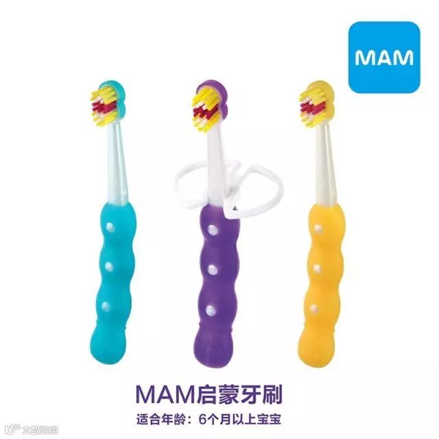 6个月以后宝宝开始慢慢长牙,小M推荐给宝妈们,宝宝的第一把牙刷,一把时尚、绚丽的启蒙牙刷,6months,一款巧妙结合医学功能的婴儿产品。所有MAM的产品都是与国际儿童医学研究协会以及健康护理专家共同研发的。