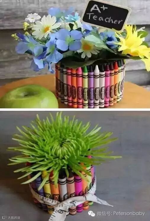 既简单又好看只需要把彩色蜡笔排列好顺序粘在一个玻璃花瓶上就好啦别的同学都送花我们就偏偏送花瓶~