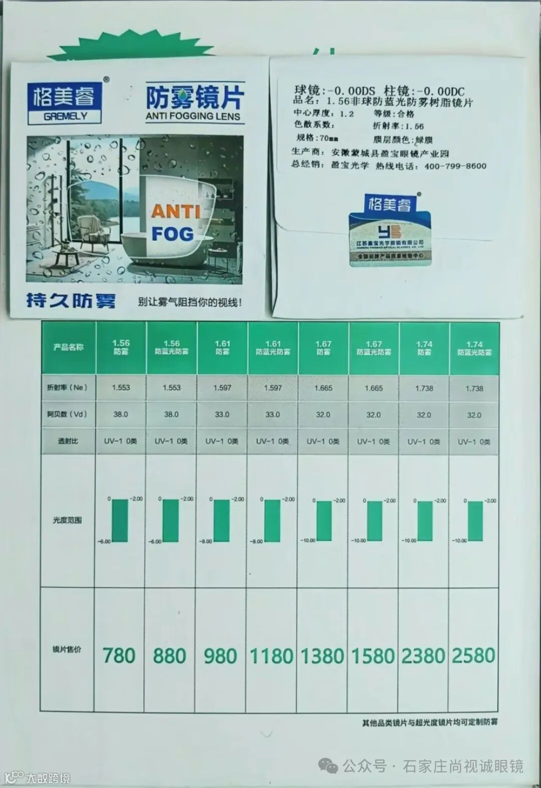 公司现有格美睿1.56、1.60防雾防蓝系列镜片现货。新品上市批量备货福利多多!这个冬天,让雾气不再困扰你我他,让安全更安全,店面不再经历寒冬!