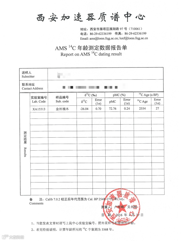 ①阴沉木:长11m;直径(小头)1.45,大头2m;约13.56吨,共1件;AMS14C年龄测定报告显示为2554年;