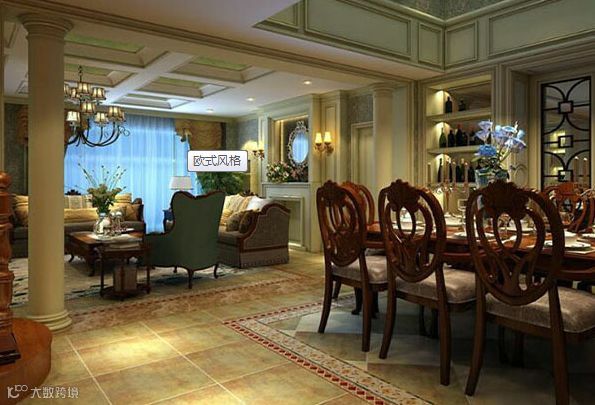 欧式风格装修中地面的主要角色应该由地毯来担当。地毯的舒适脚感和典雅的独特质地与西式家具的搭配相得益彰。选择时是图案和色彩相对淡雅,过于花哨的地面也许会与欧式古典的宁静和谐相冲突。